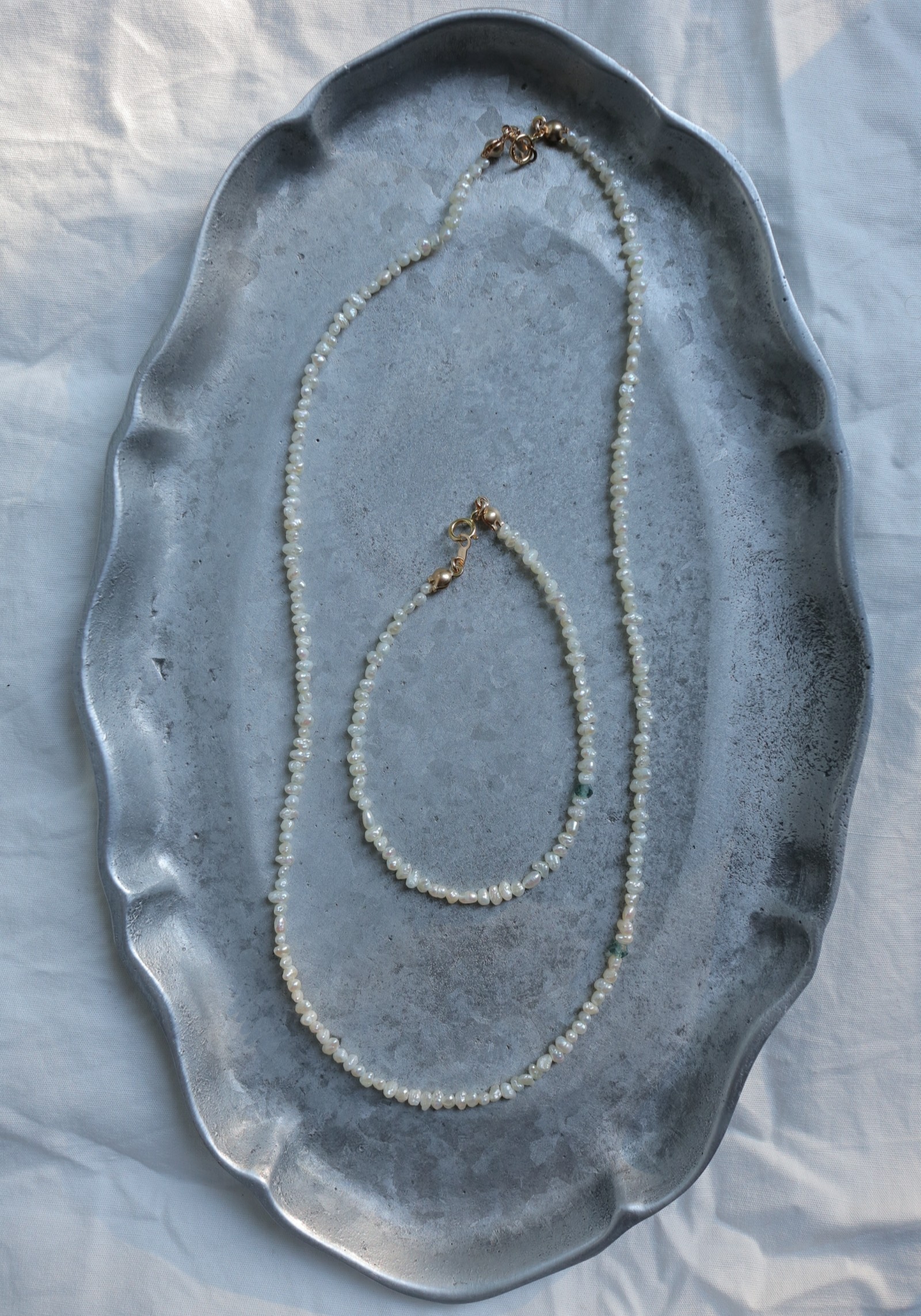 ケシパールとボタンカットされたグリーンクォーツのネックレスとブレスレット。