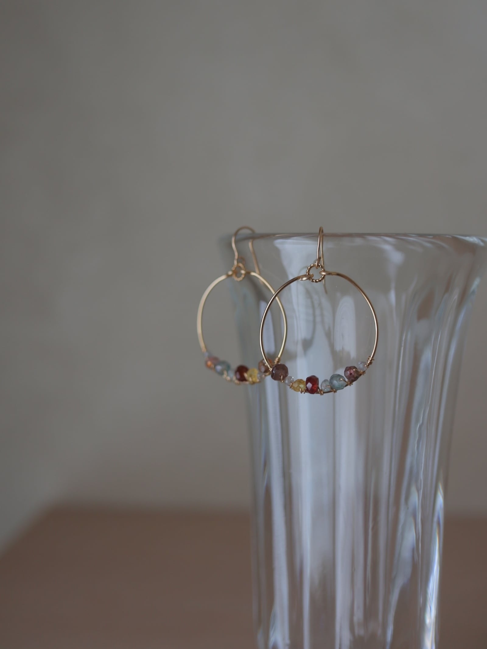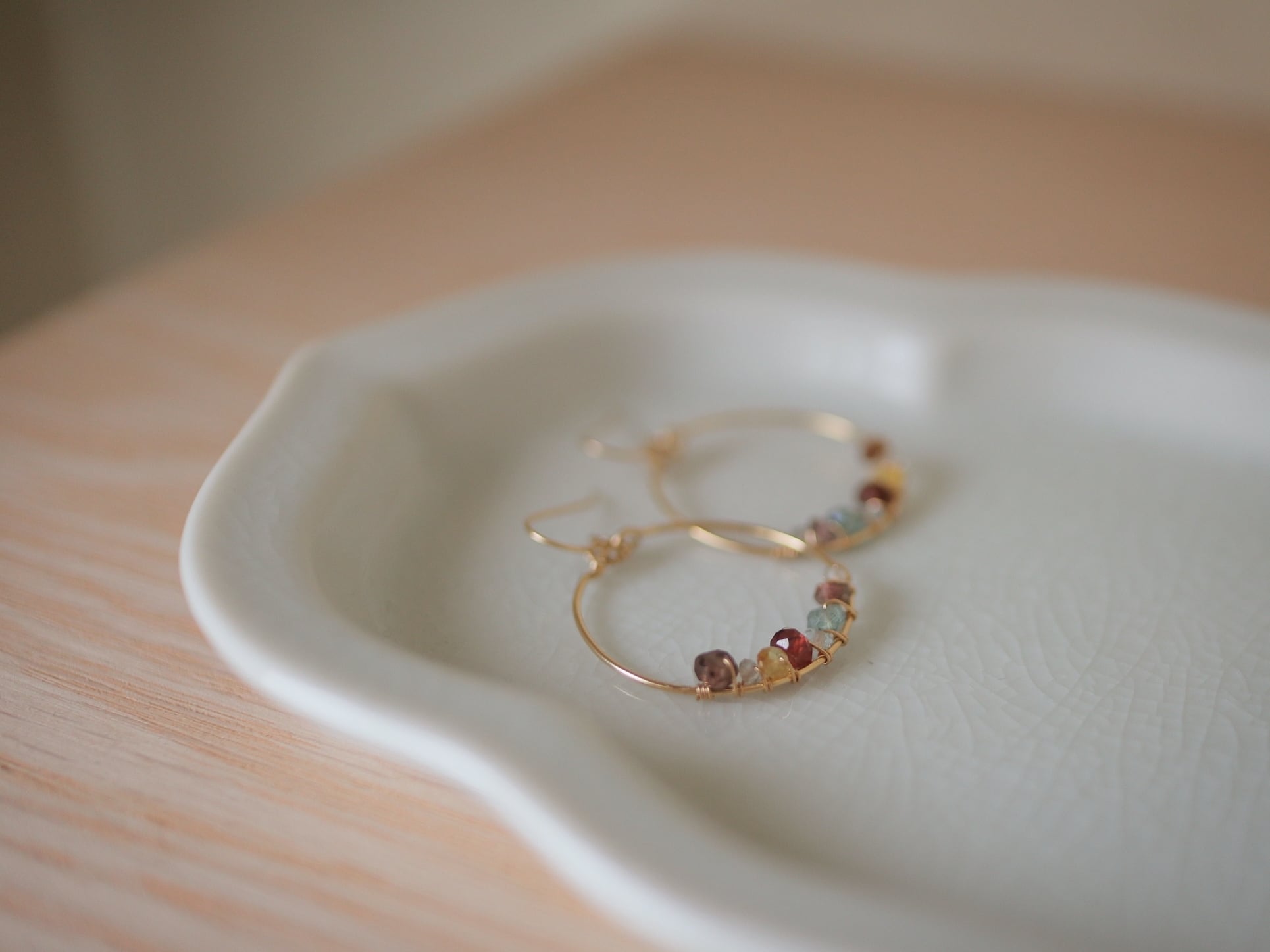 極小の天然石、それぞれの深みのある色と美しいカットが光を集め、繊細な存在感を放ちます。