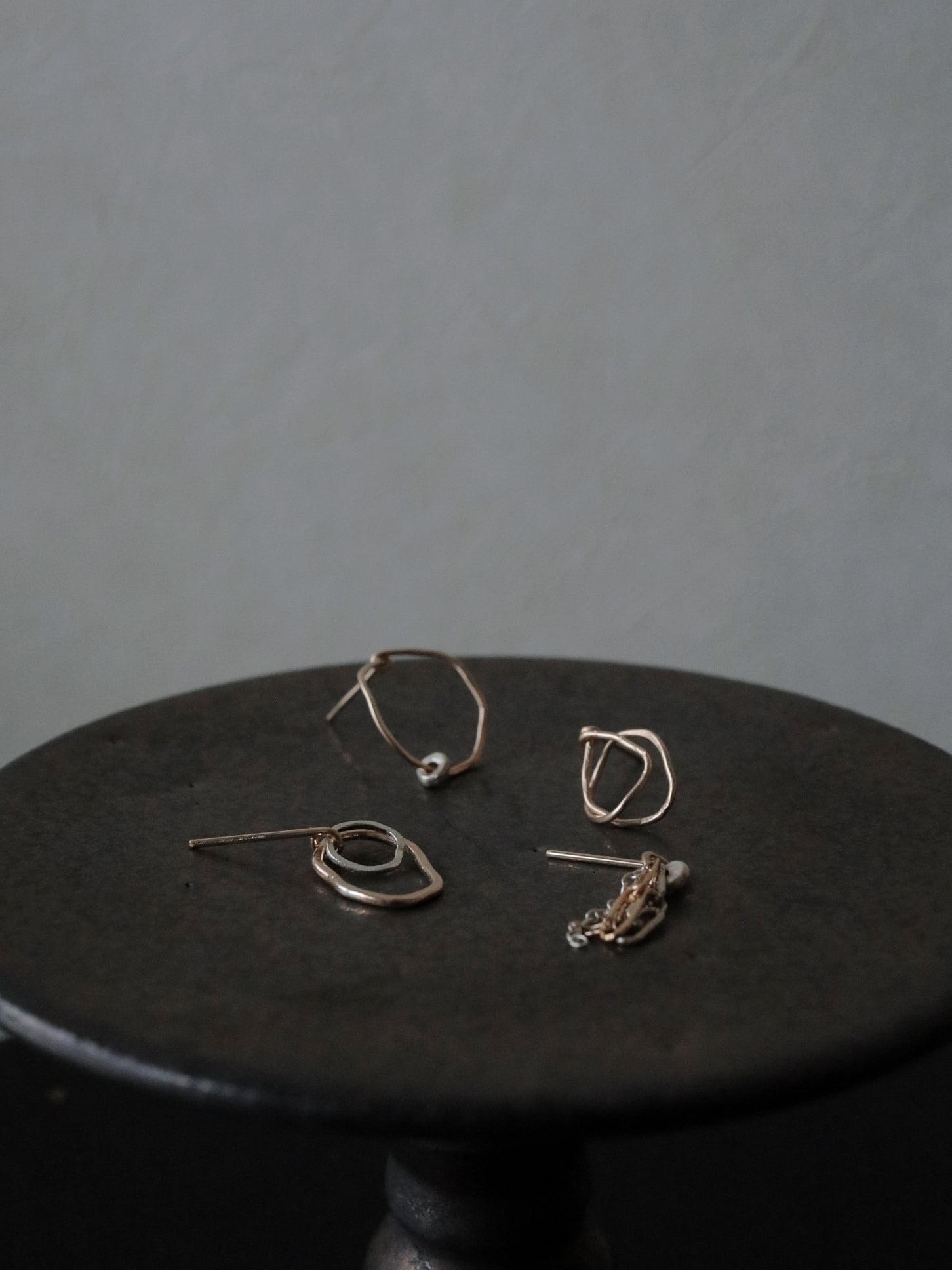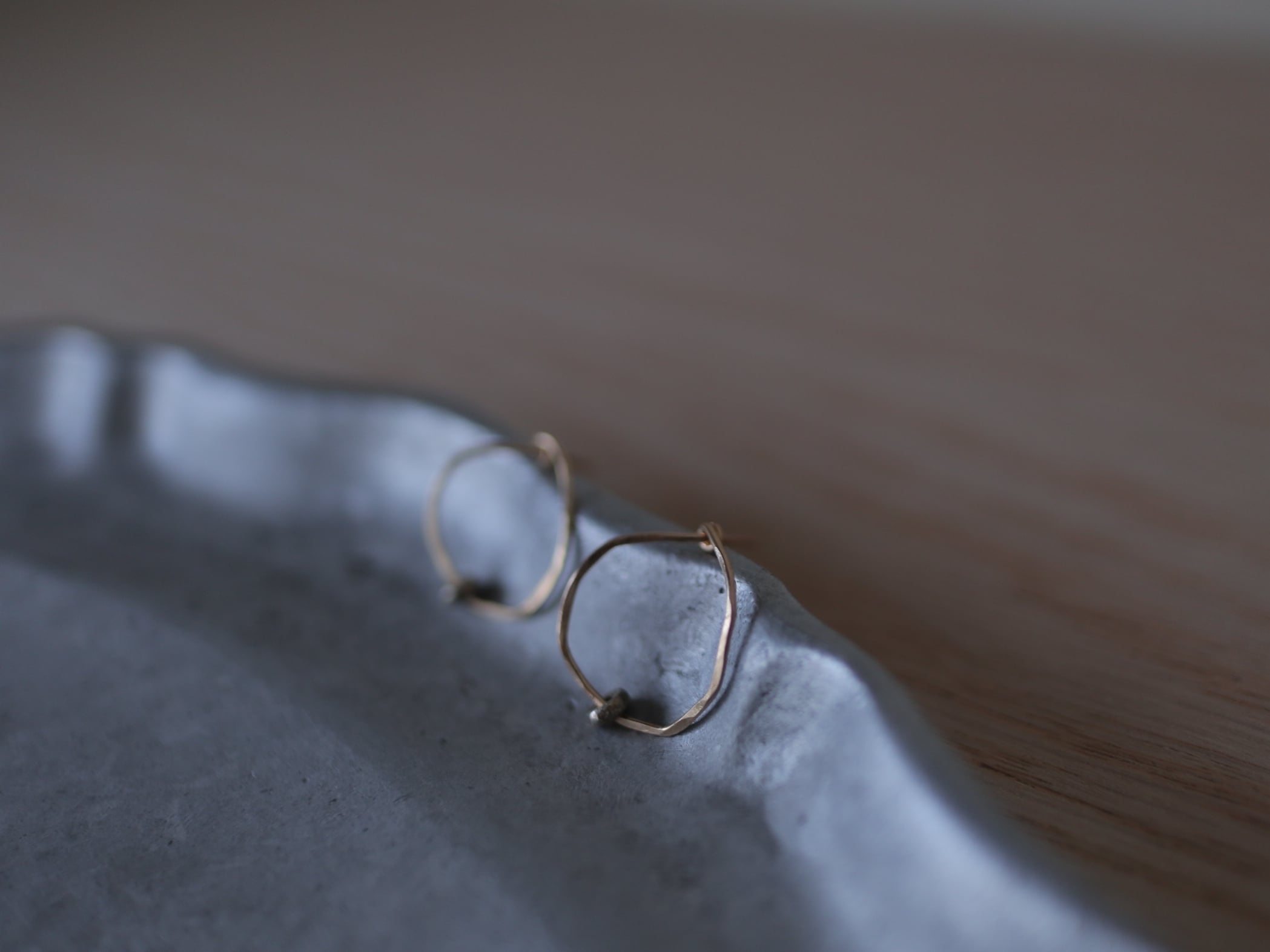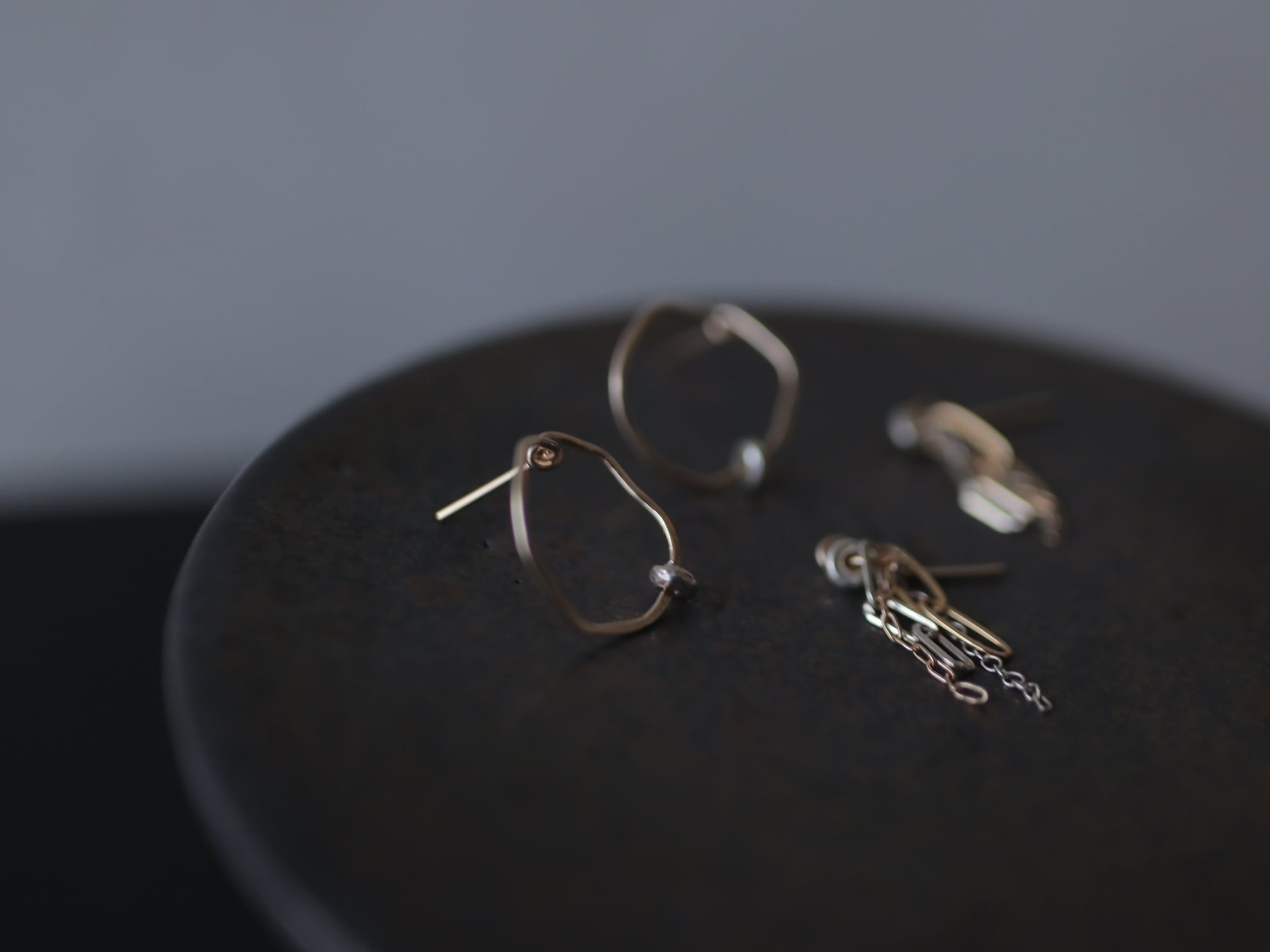 ♢肌馴染みのよいk14gfの地金に槌目のテクスチャーを施し、タイ北部の山岳民族、カレン族の伝統技法によって作られたカレンシルバービーズを使用したスタッドタイプのピアスです。