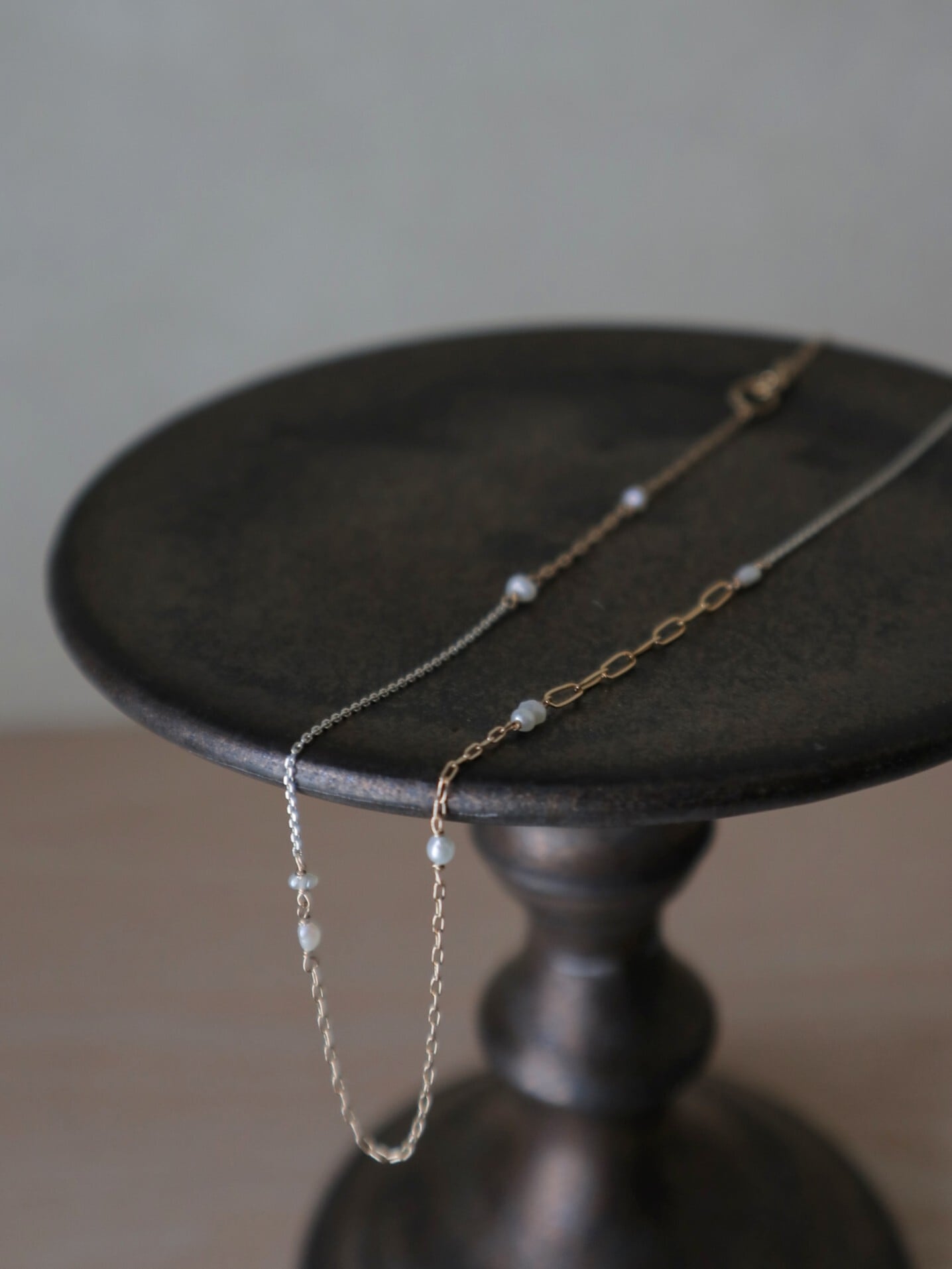 そして極小の艷やかな淡水パールのブレスレットは、まるで身につけていることを忘れてしまいそうなくらい肌にそっと馴染むデザインです。