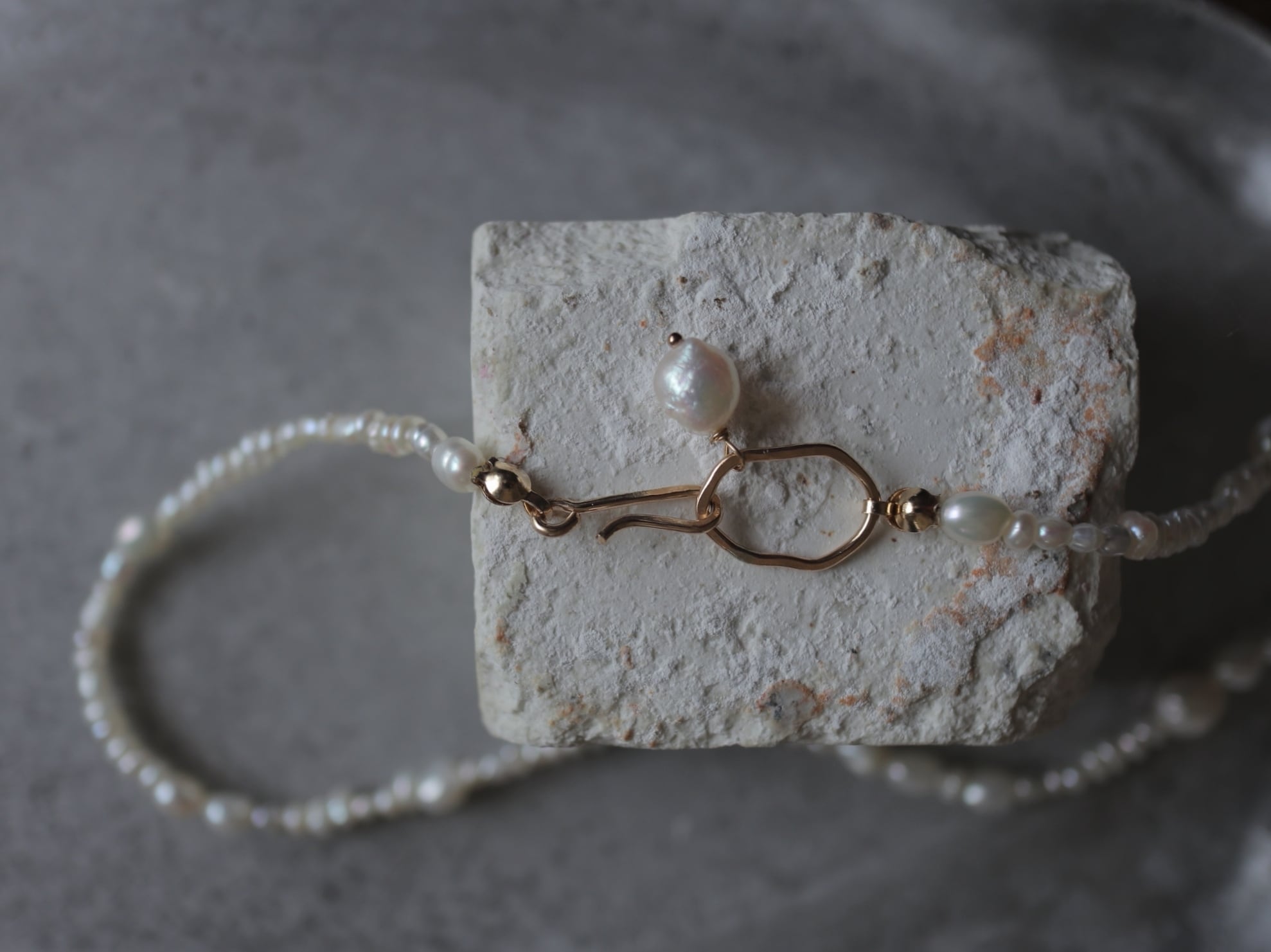 一つ一つ表情の違うユーモアラスな淡水パールを組み合わせ、金具部分のデザインにもこだわることで