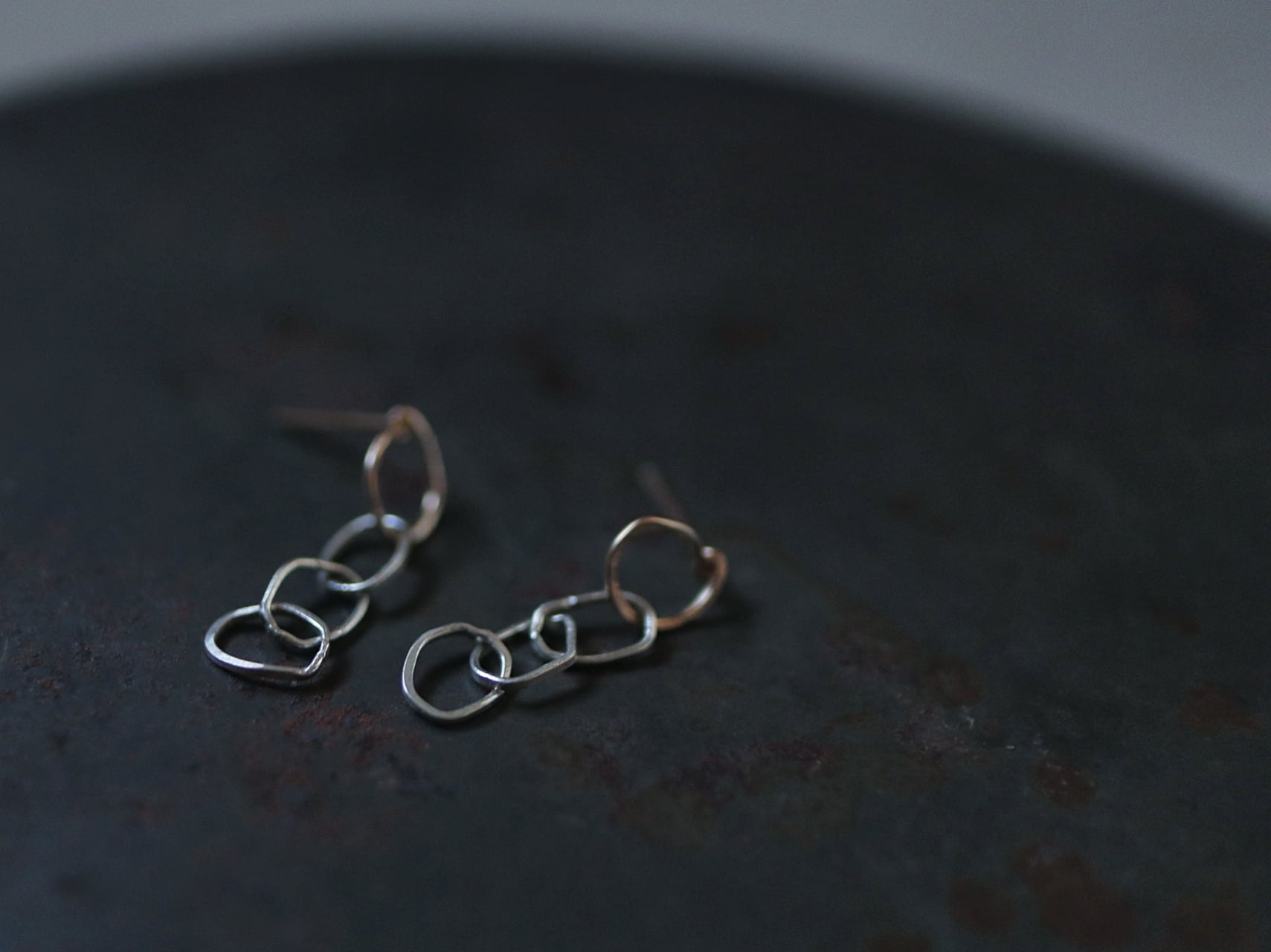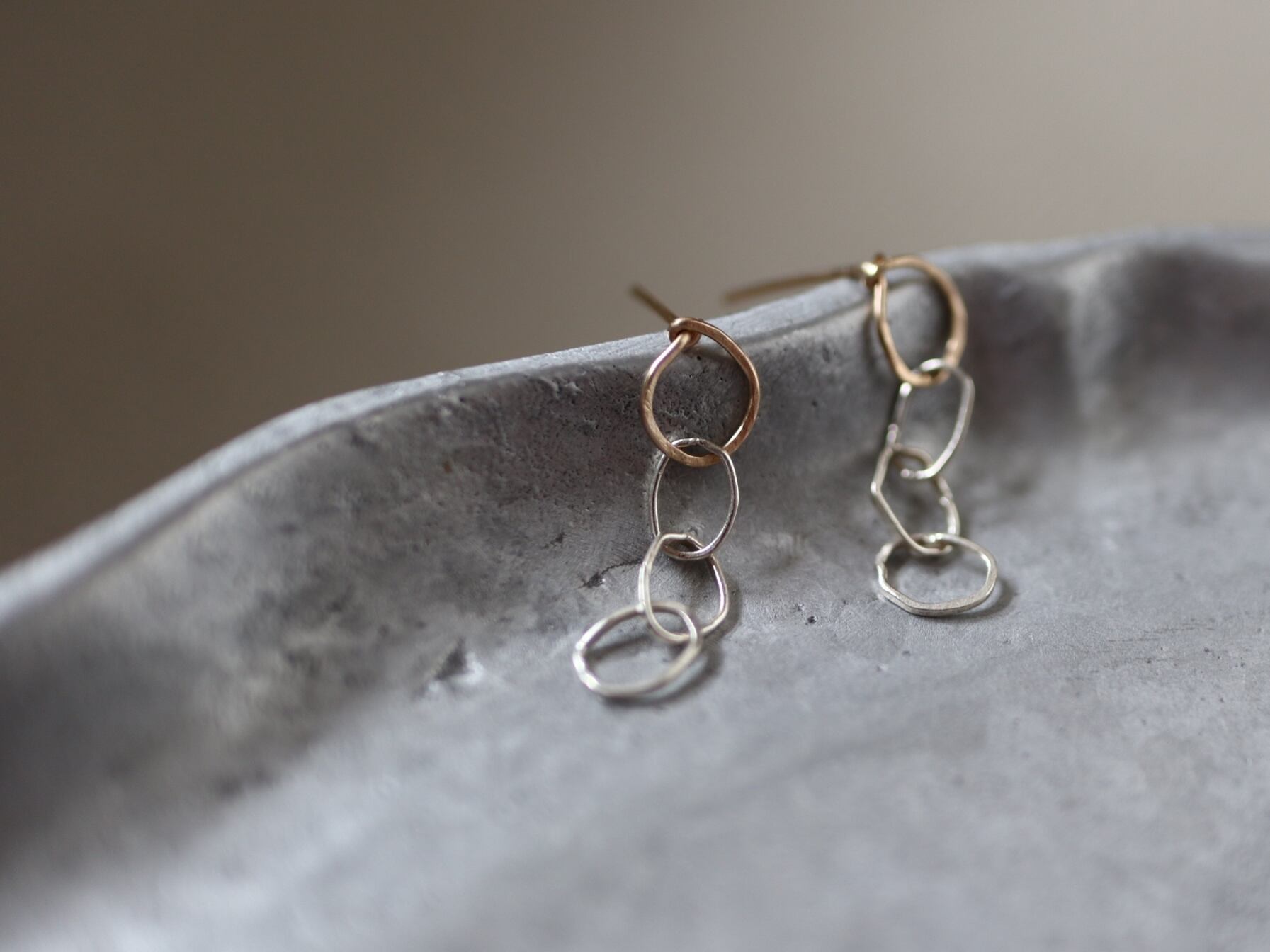 ♢槌目テクスチャーを施した、シルバーカラーとゴールドカラーのコントラストが印象的なピアスです。華奢で繊細な金線でありながら動きのあるデザインに仕上げました。