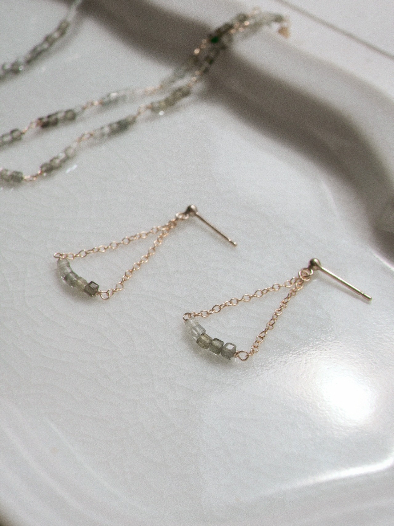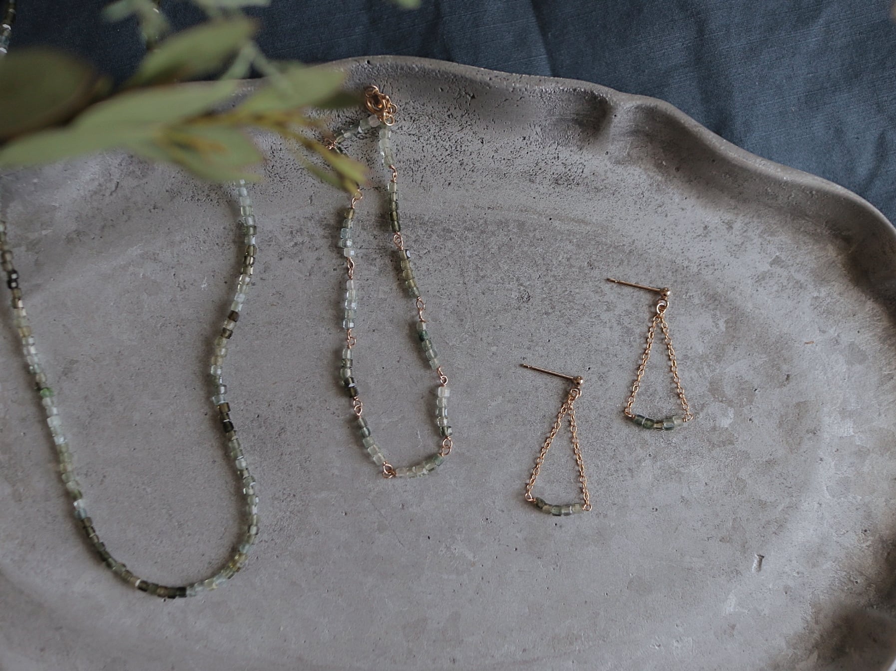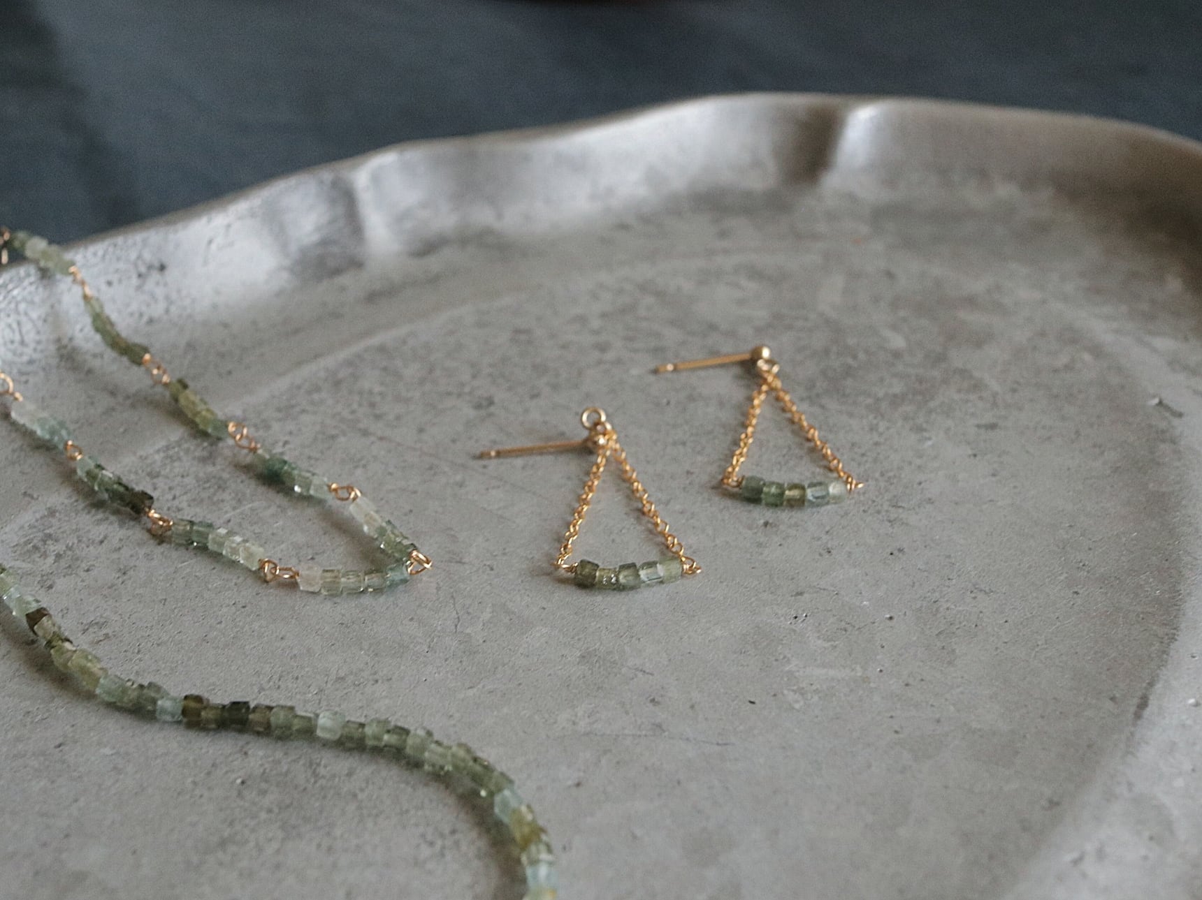 グリーントルマリンの中でも肌に馴染むモスグリーンカラー、そしてグラデーションが美しいものを厳選いたしました。光を集め、きらきらと放つ計算されたカットはトルマリンの美しさを引き出します。